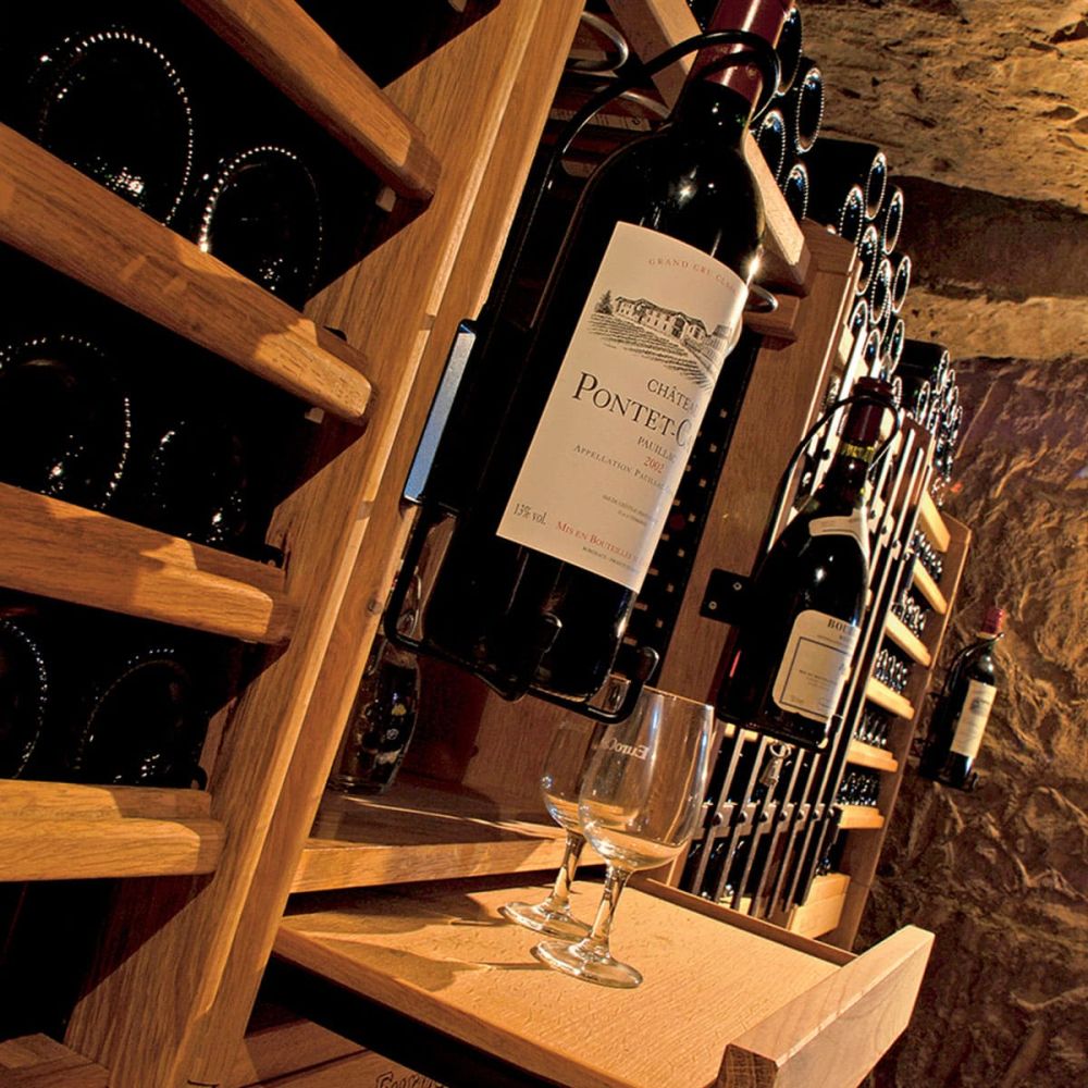 Agencement modulable en bois massif pour une cave à vin authentique.