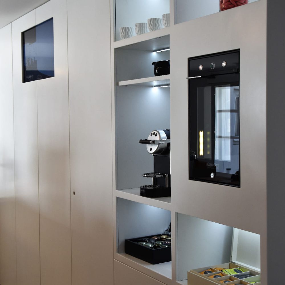Des portes vitrées et un éclairage multicolore* au sein de chaque compartiment, théâtralisent les références de votre carte des vins.
